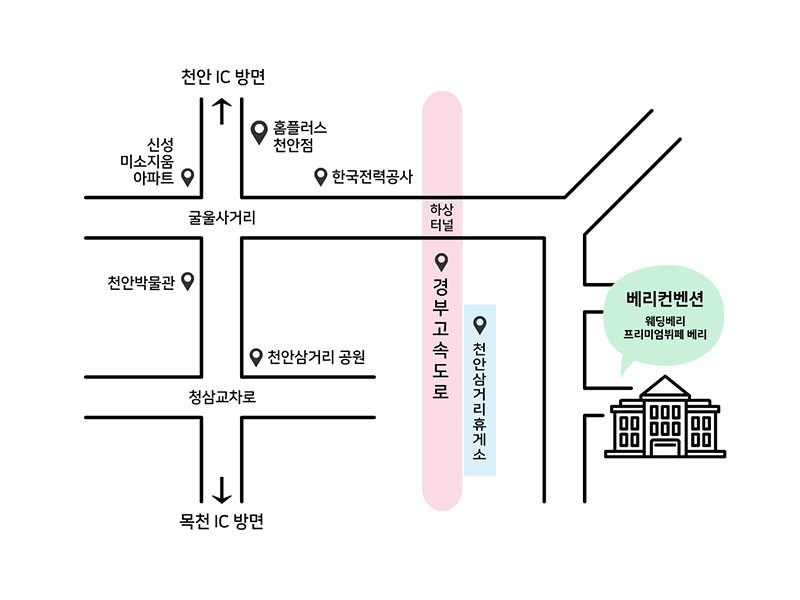 약도 및 교통 안내 Shuttle Bus 셔틀버스 첫 예식시간 1시간 전부터 30분 간격으로 운행 예) 12시 예식의 경우 11:00 / 11:30 / 12:00 / 12:30 .... 천안터미널 출발 → 천안역 경유 → 웨딩베리 도착 천안터미널 탑승 장소 천안터미널 아라리오 갤러리 앞 "스타벅스, 올리브영" 매장 앞 천안역 탑승 장소 천안역 1번출구 동부광장 횡단보도 건너편 "빈폴매장" 옆의 "GS25 편의점" 앞 Car 자가용 네비게이션 : "베리컨벤션" 검색 주소 검색 : "천안시 동남구 해솔1길 27" 입력 네이버 빠른길 찾기 경부고속도로 상행선 <천안IC>로 나와서 <천안삼거리>방면으로 5분 <목천IC>로 나와서 <천안IC>방면으로 15분 경부고속도로 하행선 <천안IC>로 나와서 <천안삼거리>방면으로 5분 약도 인쇄 및 다운로드 라벤더홀 (베리컨벤션 본관 1층) 약도 약도 인쇄 약도 다운로드(PDF) 피에스타홀 (베리컨벤션 신관 3층) 약도 약도 인쇄 약도 다운로드(PDF)